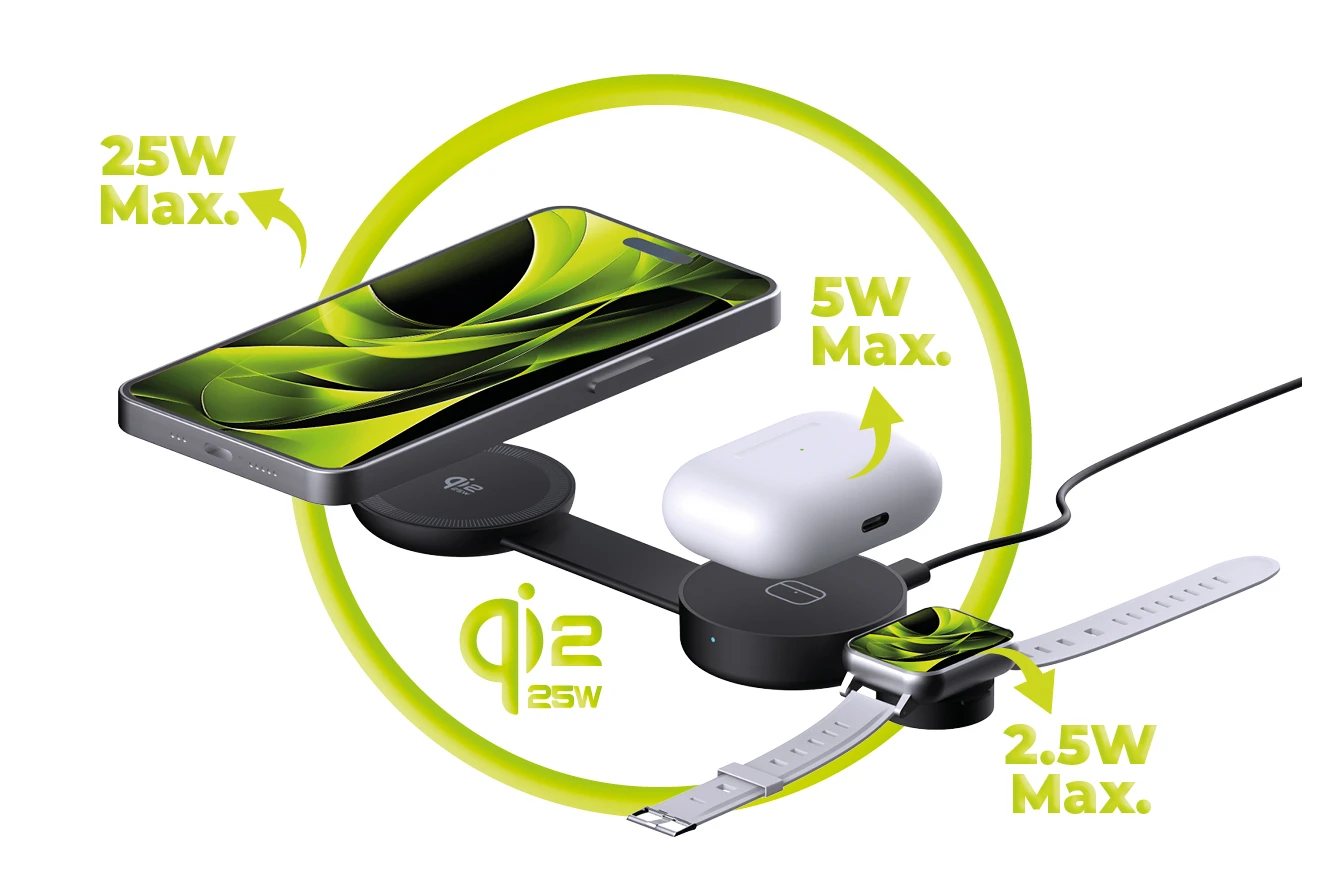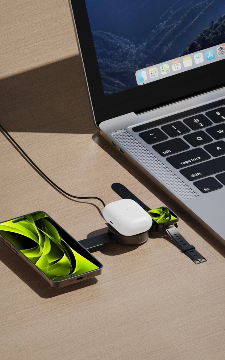 Zapomeňte na zbytečné kabely. PW34 ukrývá kompletní nabíjení pro telefon, hodinky i sluchátka v jediném zařízení. Po použití ji jednoduše složíte do kompaktního tvaru, který se pohodlně vejde přímo do kapsy. Ideální pro cestování i úsporu místa doma.