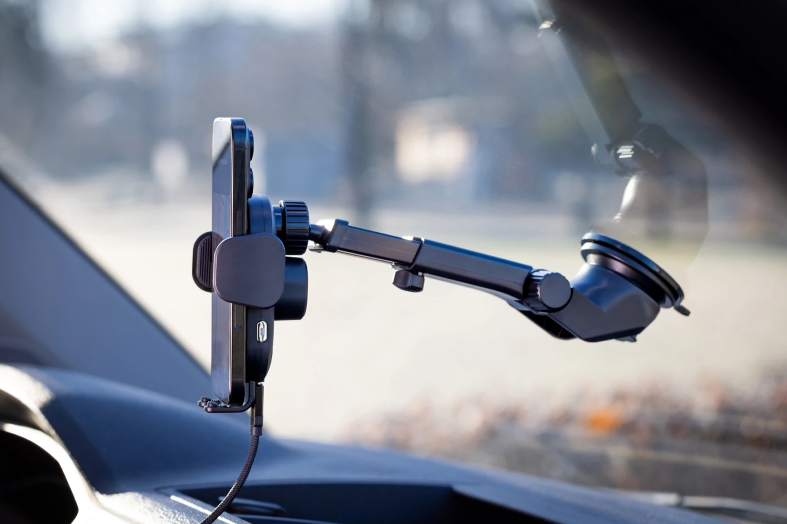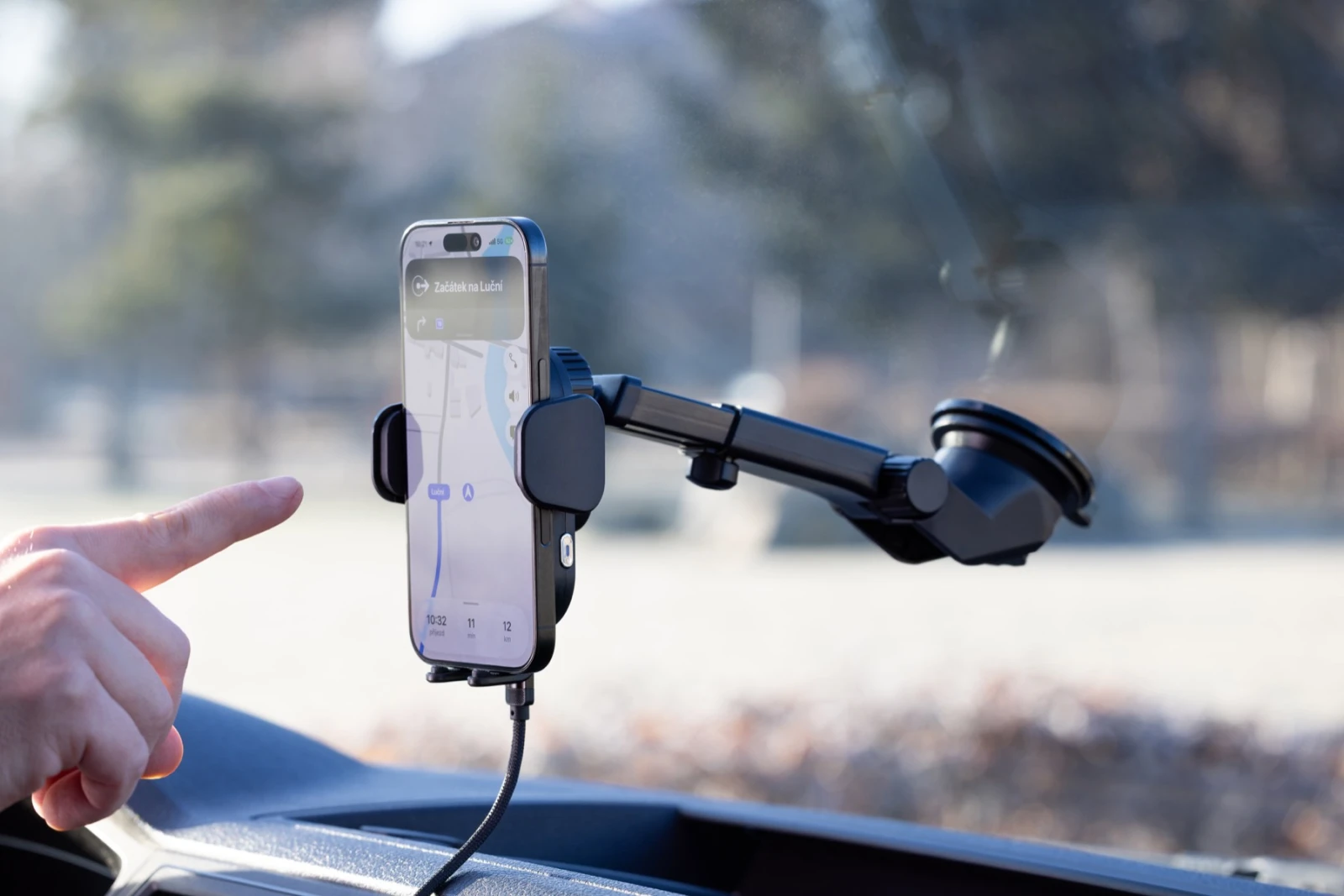 Držák snadno připevníte na palubní desku nebo čelní sklo pomocí silné přísavky. Nebo můžete využít také oblíbený úchyt do mřížky ventilace vašeho vozidla.
