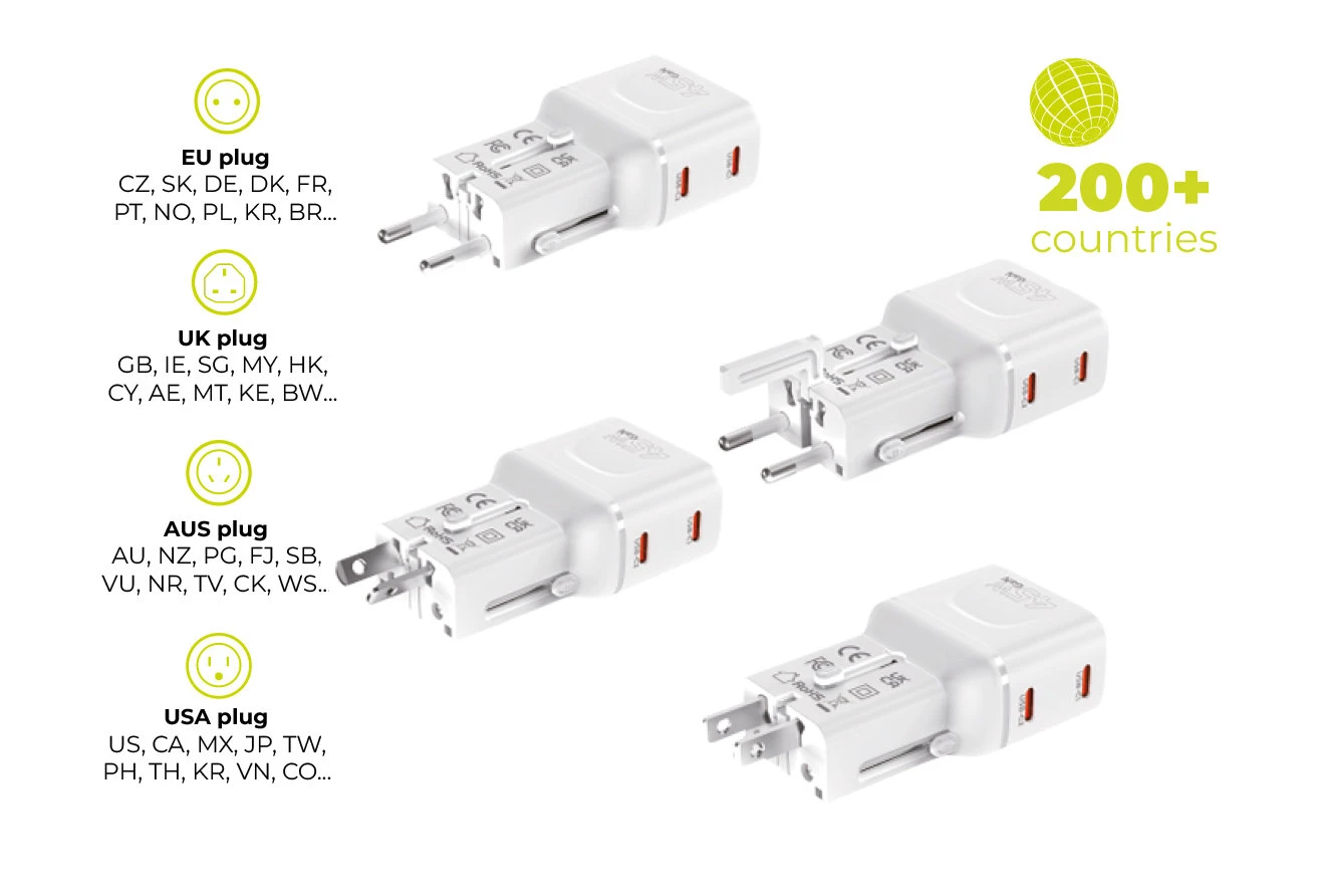 Díky vestavěným mezinárodním zástrčkám je adaptér použitelný ve více než 200 zemích včetně EU, UK, US, AUS.