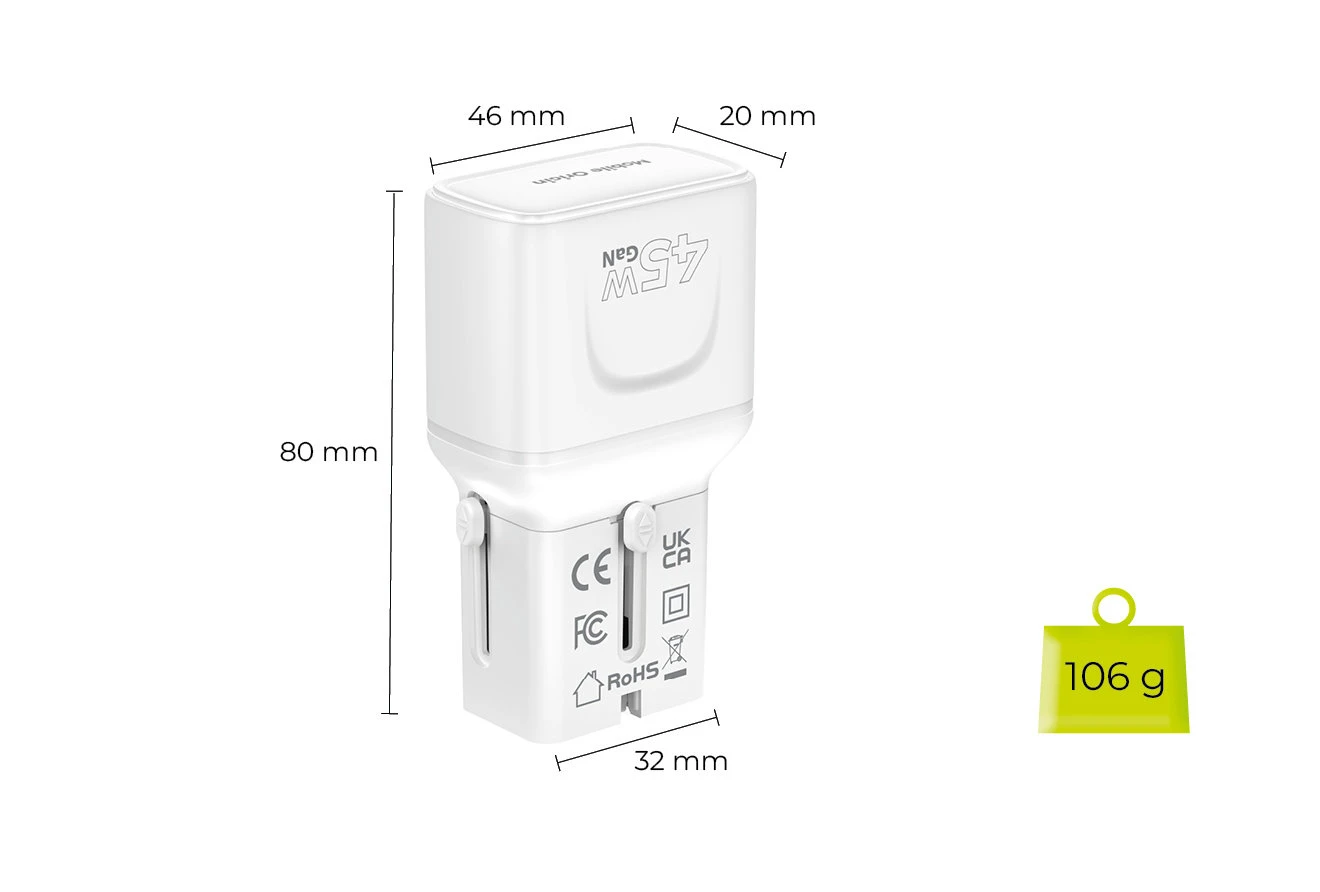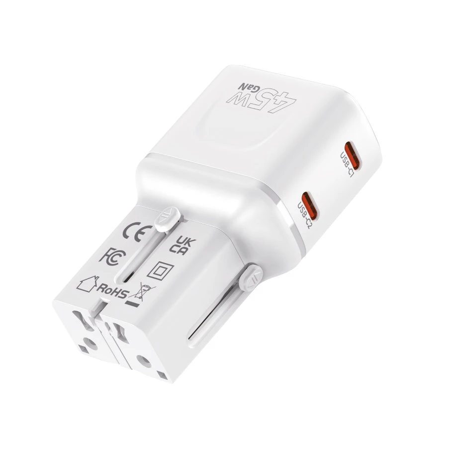 - Cestovní Adaptér GaN 45W, EU/US/UK/AU PW26, Bílá