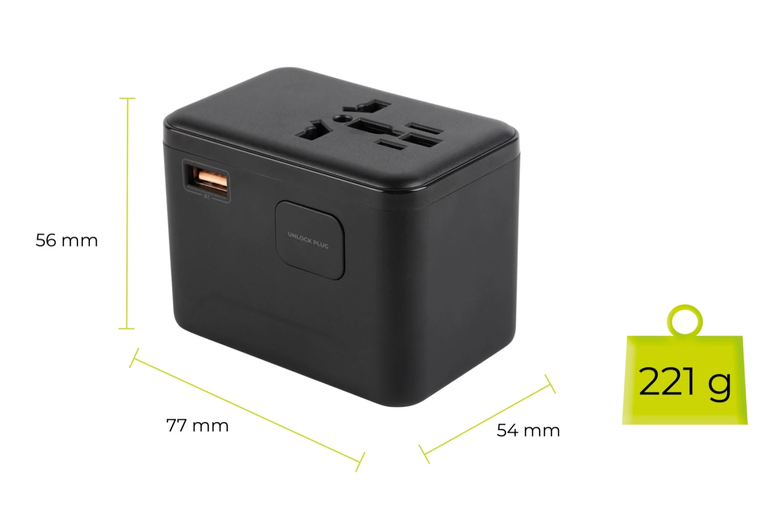 S rozměry 77 x 56 x 54 mm a hmotností pouhých 221 g je tento adaptér snadno přenosný. Jeho elegantní černý design se hodí do každé cestovní tašky a nezabere téměř žádné místo.