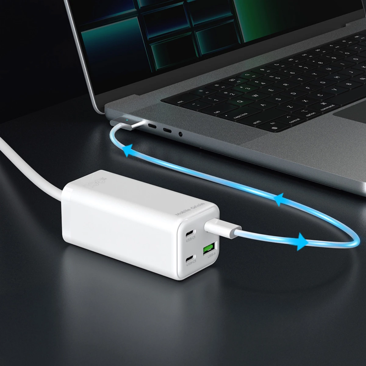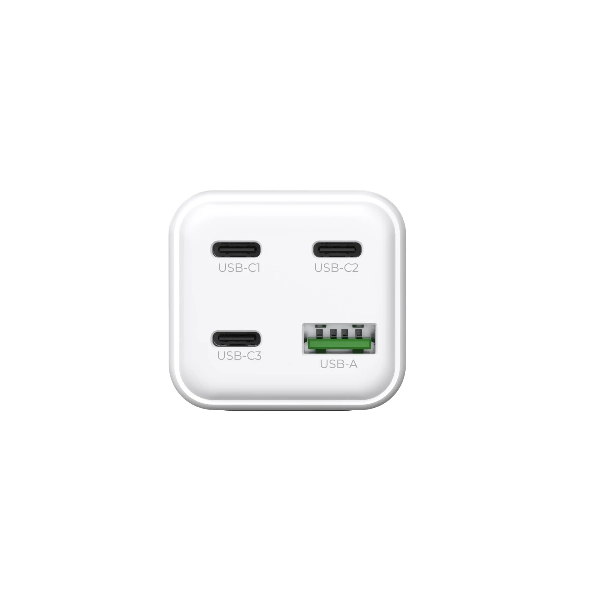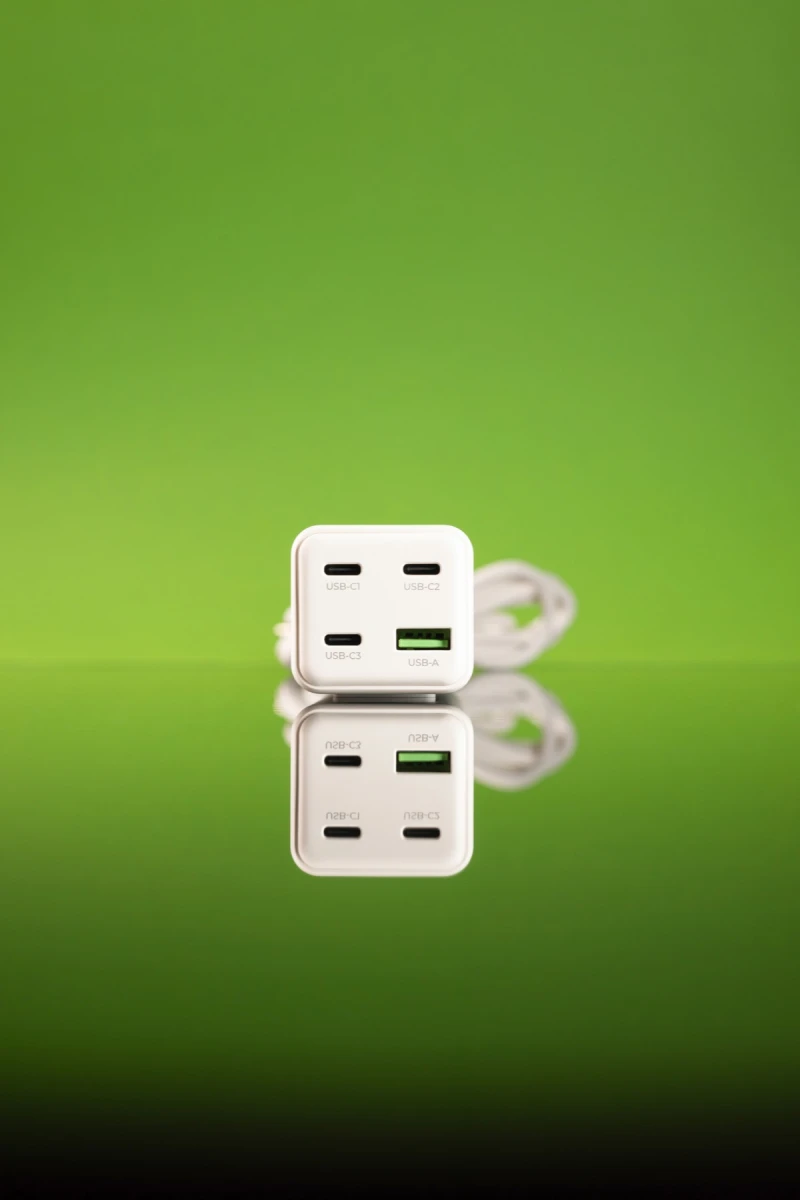 Díky čtyřem portům (3× USB-C + USB-A) nabízí tato nabíječka flexibilní možnosti – od rychlého nabíjení notebooku až po doplnění energie vašich sluchátek.