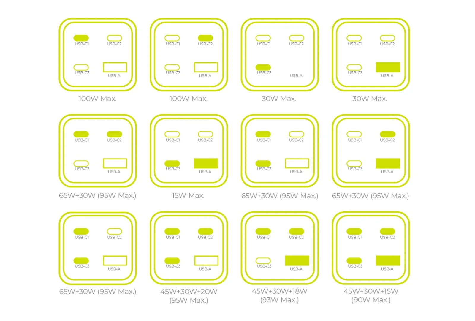 - USB-C1+C2+A: 45W+30W+18W (93W Max)