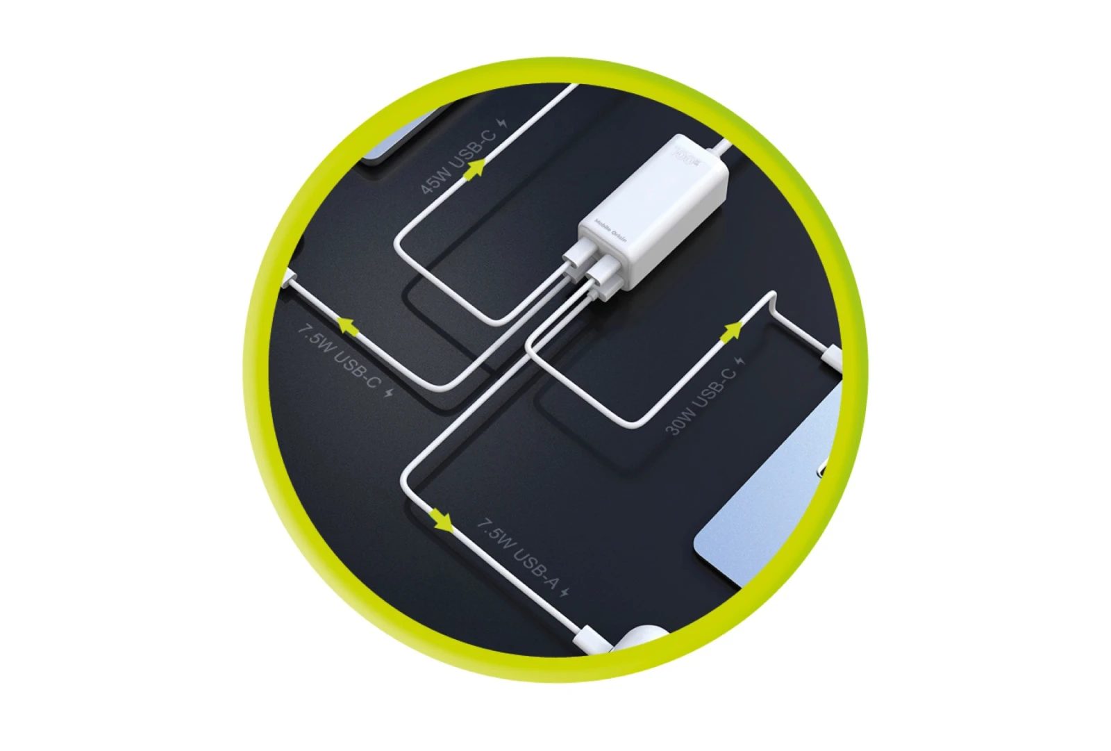 S 3× USB-C a 1× USB-A portem můžete současně nabíjet notebook (45 W), tablet (30 W), smartphone (7.5 W) i sluchátka (7.5 W) – rychle, efektivně a bez kompromisů.