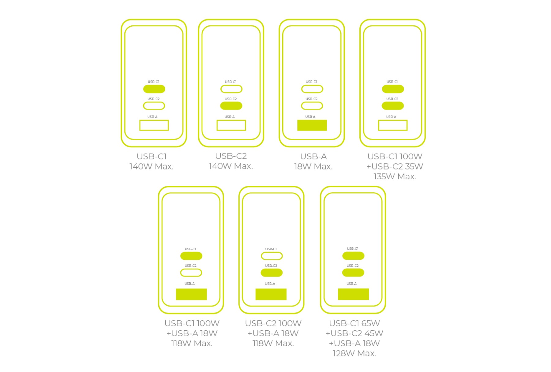 Cestovní nabíječka GaN 140W PW12 EU/UK/US, 3x USB-C + 3x USB-A