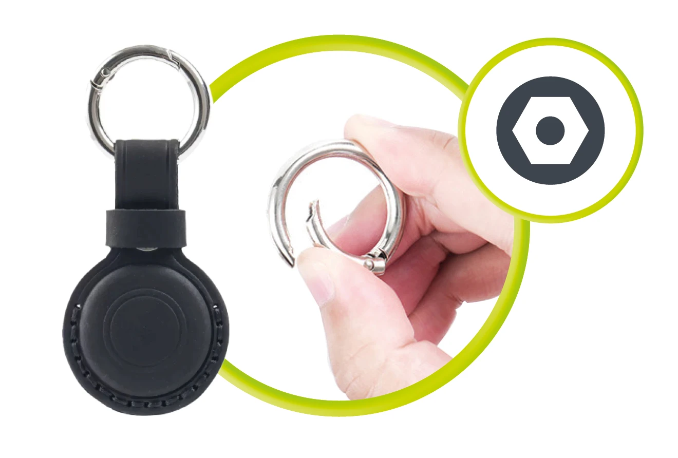 Ocelová karabina umožňuje snadné připnutí na klíče, batoh nebo zavazadlo. Vložení AirTagu do klíčenky je otázkou vteřin. Pevný kovový druk bezpečně uzamkne lokátor uvnitř a díky koženému poutku nehrozí jeho odepnutí ani vypadnutí. Přitom k němu máte v případě potřeby rychlý a snadný přístup.
