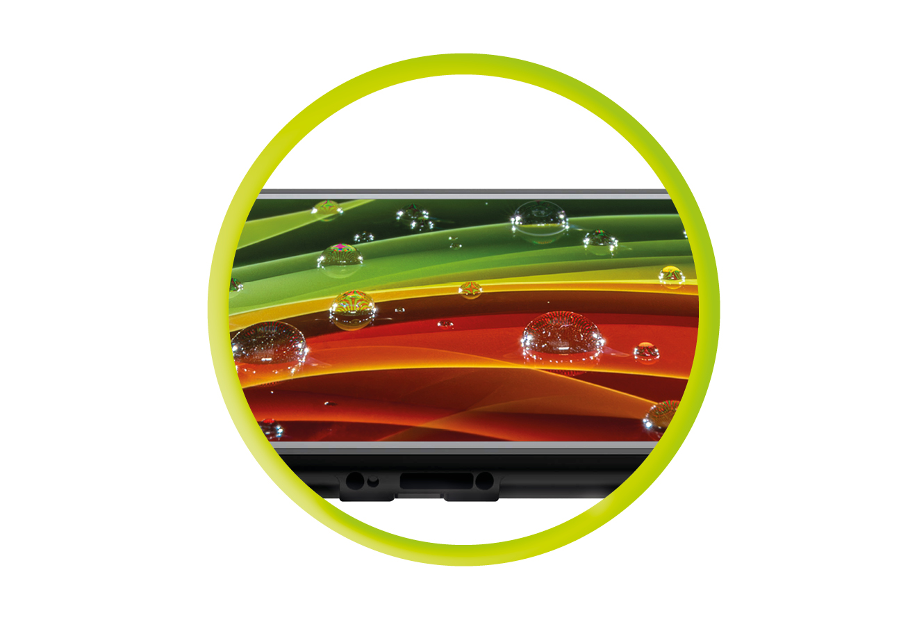 Thanks to an advanced hydrophobic electrochemically coated oleophobic layer, the glass resists fingerprints, grease, and water. This coating also increases friction resistance, allowing for a clear and clean display.