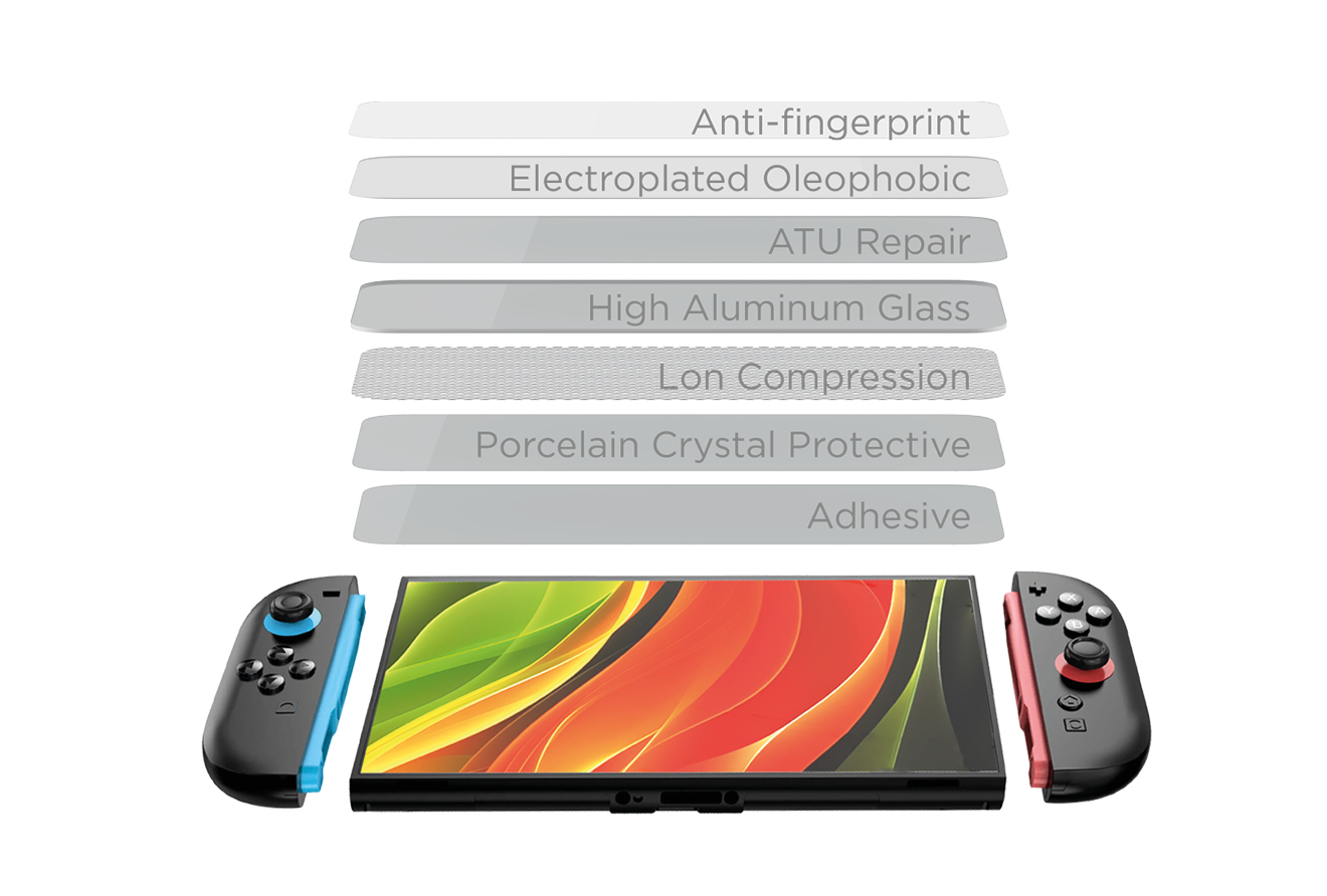 Protect your Nintendo Switch with Mobile Origin EasyGlass protective glass. With a hardness of 9H and a seven-layer aluminosilicate construction (only 0.33 mm thick), it resists scratches and impacts. The 2.5D rounded edges fit perfectly, and the oleophobic layer repels fingerprints and dirt.
