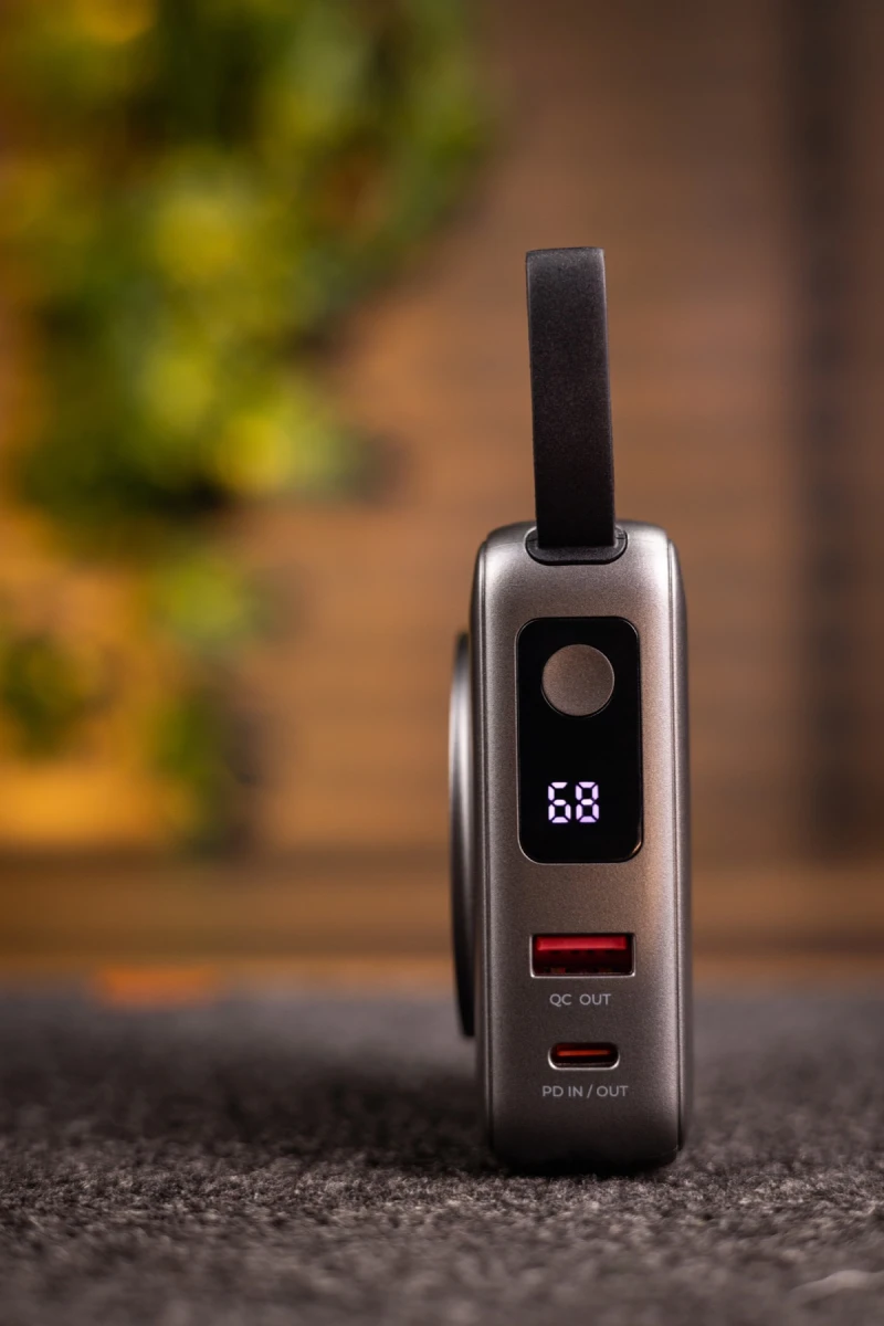 The power bank is equipped with USB-A and USB-C ports, enabling fast charging for devices supporting Quick Charge and Power Delivery technologies. The LCD display clearly shows the charge status.