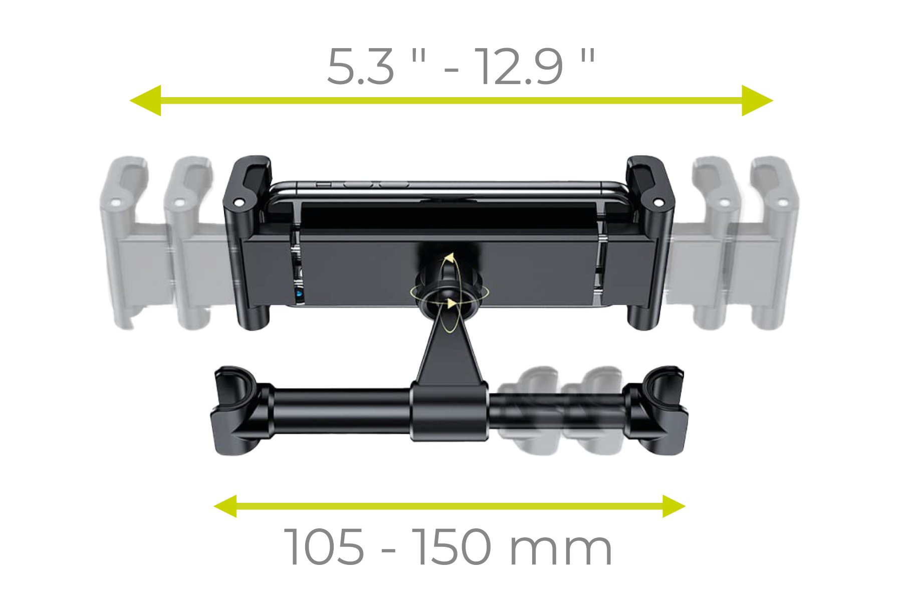 Fits a wide range of tablets, phones, consoles (5.3 - 12.9 inch) and headrests (105 - 150 mm).